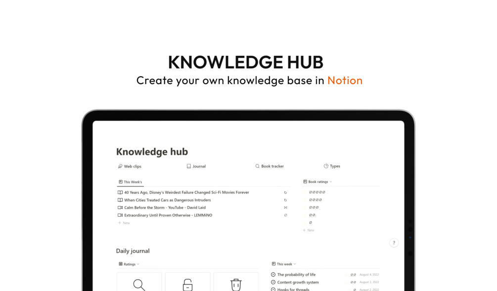 Knowledge Hub is a knowledge-centered template for an active learner which helps to manage your web clips, create daily journals, and track your book's progress by watching timelines.